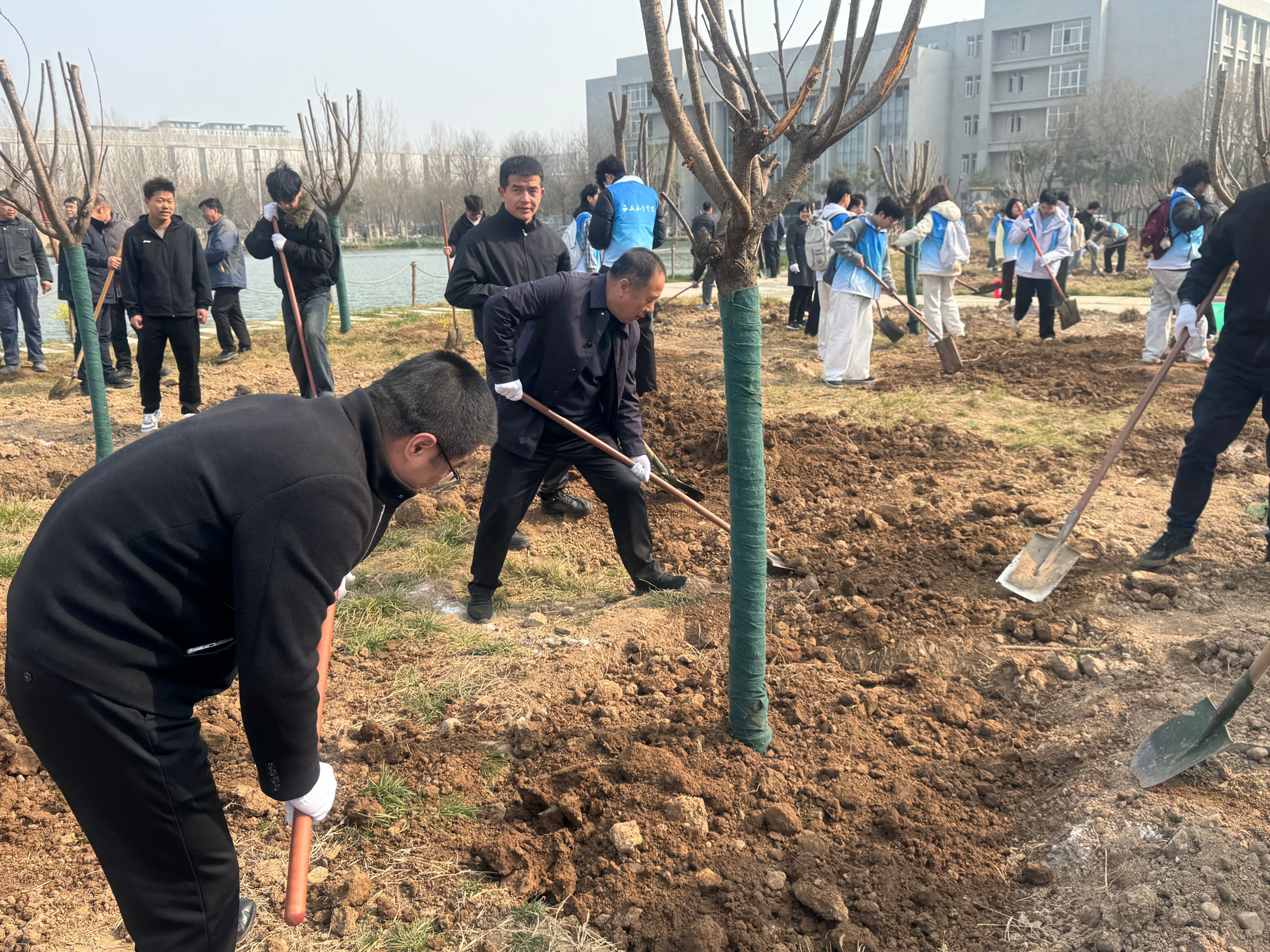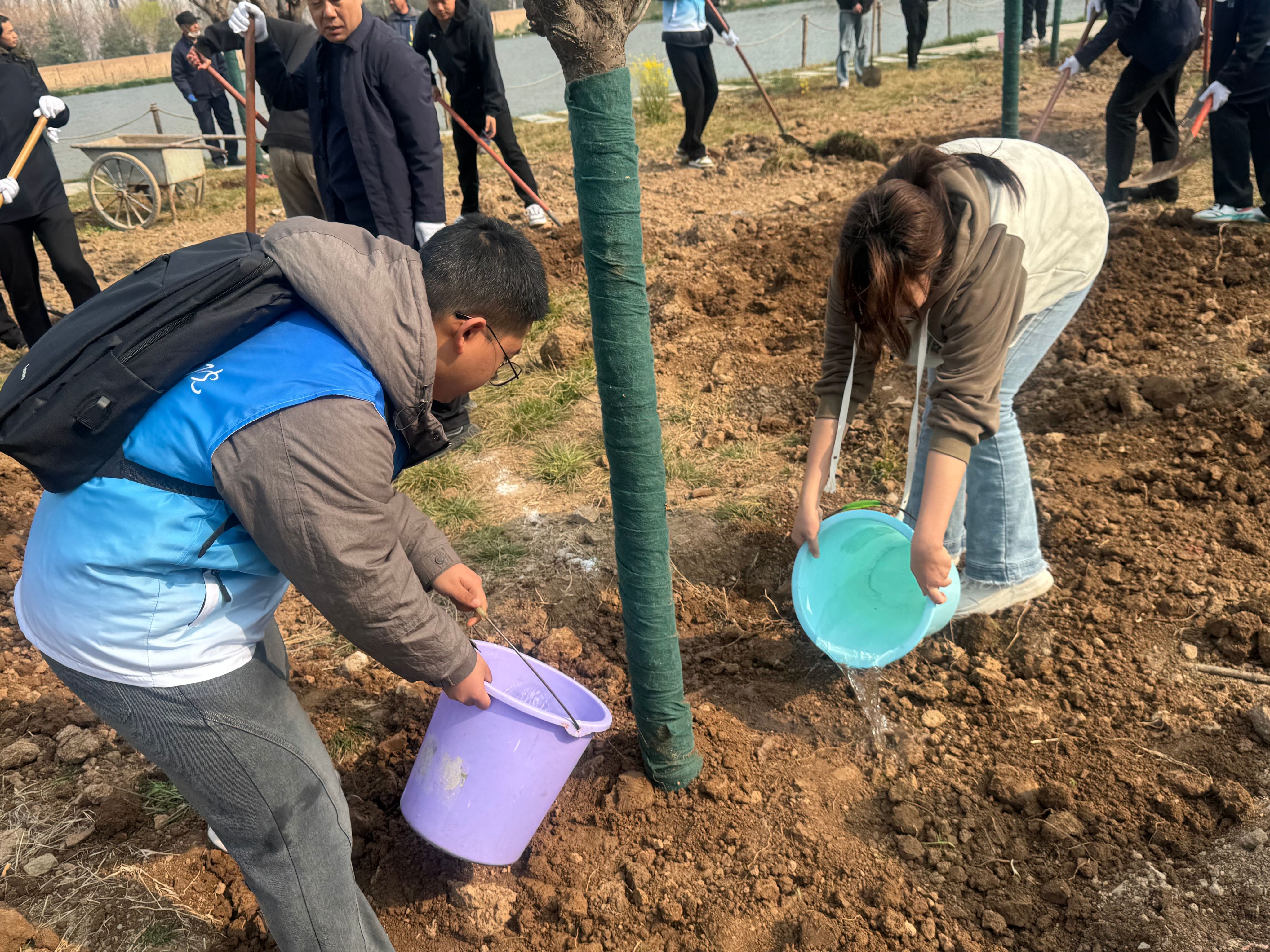 植树现场热火朝天。大家三五成组,默契配合——挥锹培土、扶正树苗、围堰夯实、提桶浇水,每一个动作都倾注着对绿色校园的深情寄望。经过一上午的辛勤劳作,100余株樱花苗木整齐挺立、迎风焕新,为初春的校园增添了一片勃勃生机。