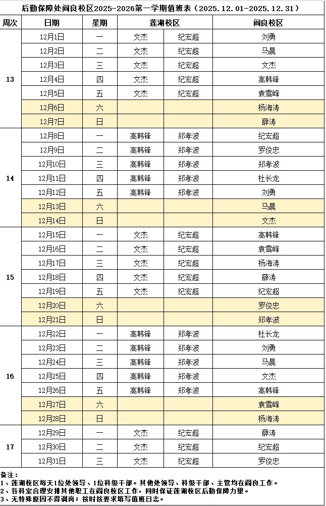 后勤保障处阎良校区2025-2026第一学期值班表(2025.12.01-2025.12.31)