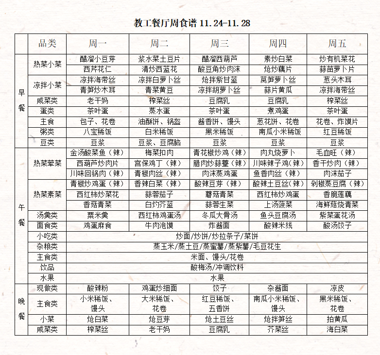 教工餐厅周食谱(11月24日——11月28日)
