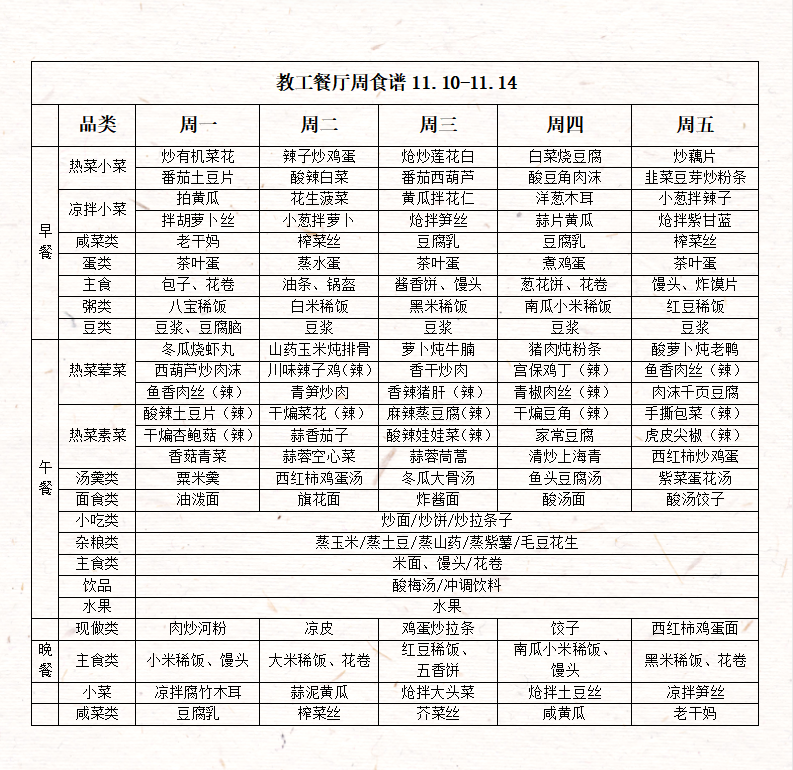 教工餐厅周食谱(11月10日——11月14日)