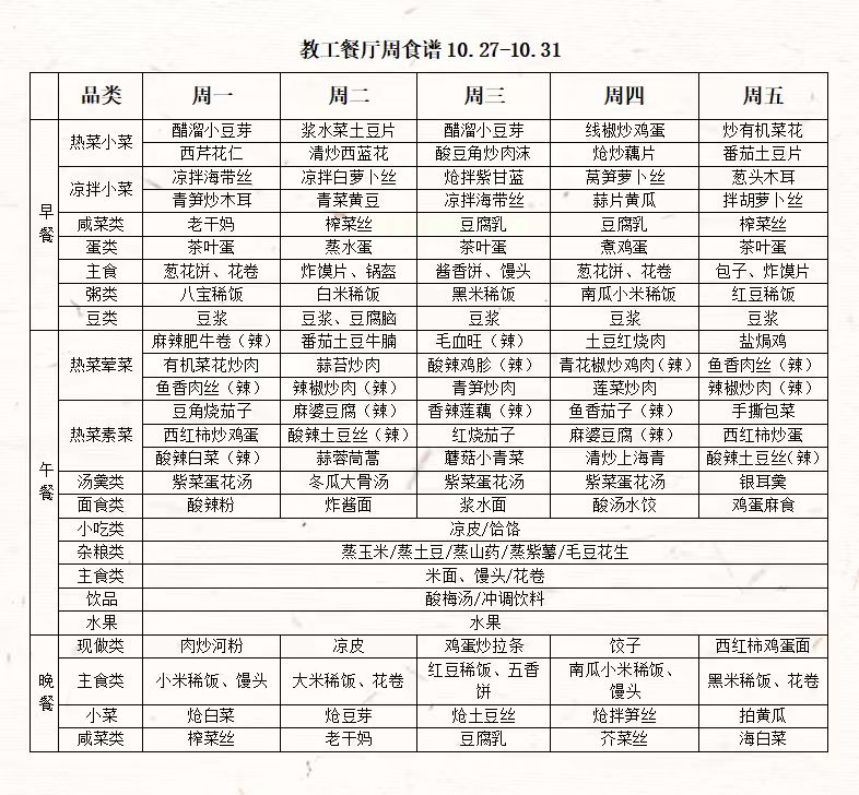 教工餐厅周食谱(10月27日——10月31日)