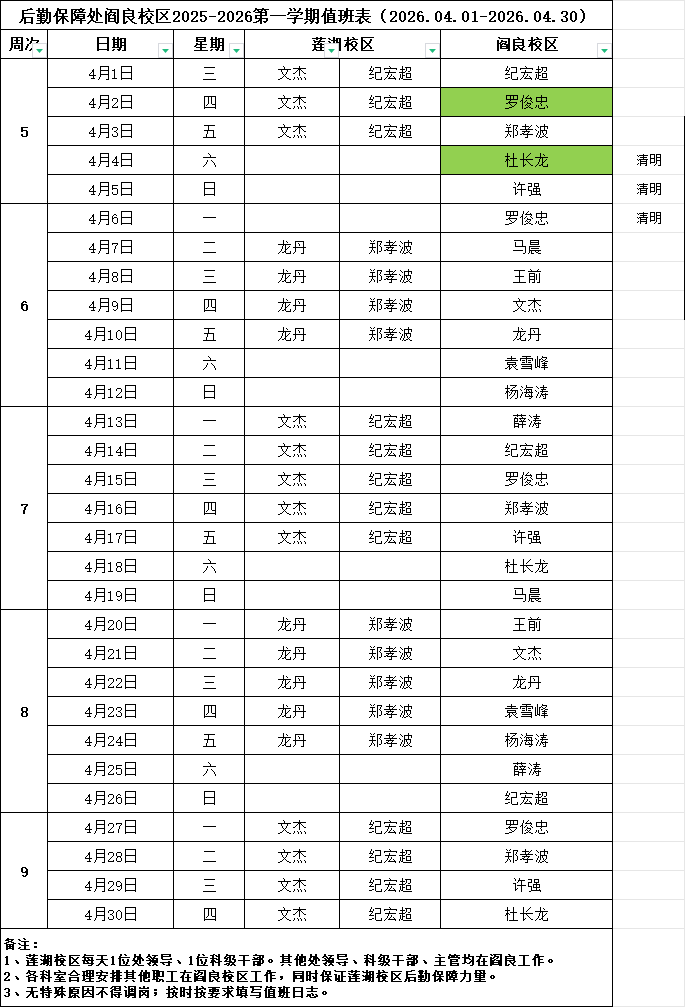 后勤保障处阎良校区2025-2026第一学期值班表(2026.04.01-2026.04.30)