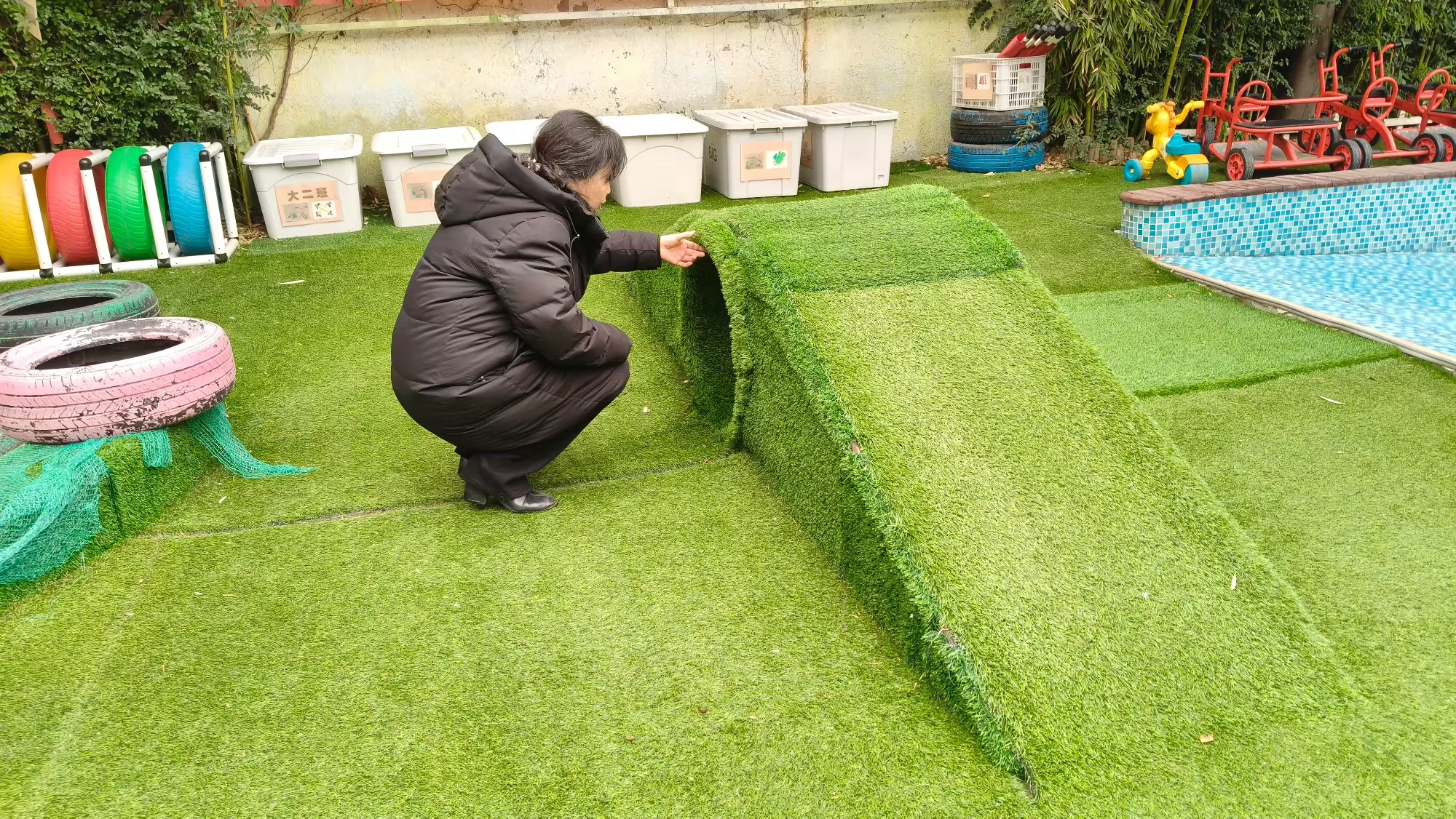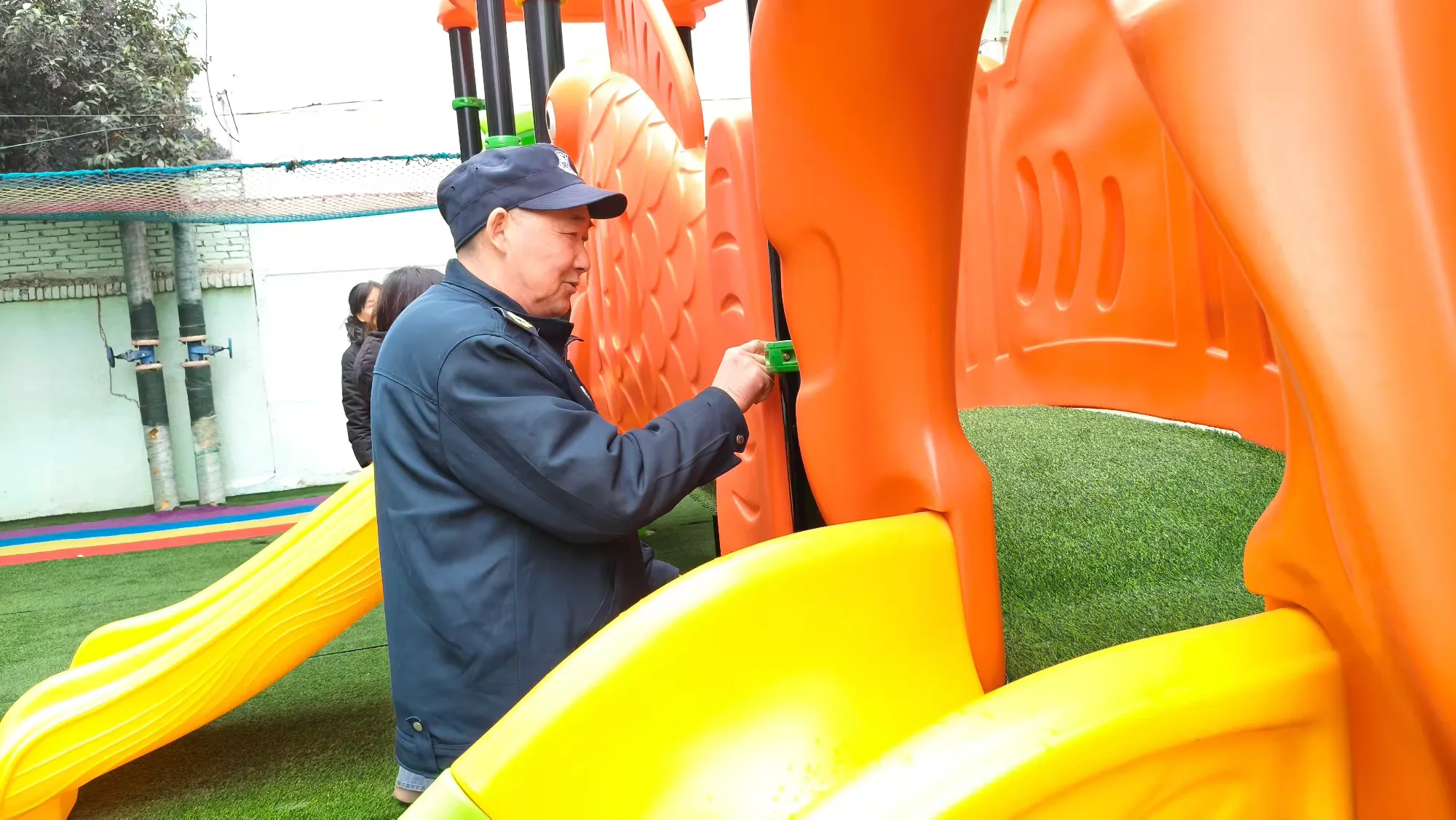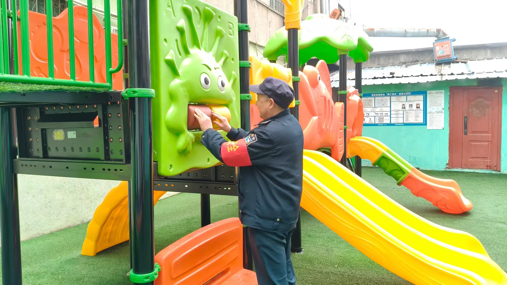 户外游戏场地是幼儿活动的高频区域,也是排查重点。安全排查小组逐一检查滑滑梯、爬坡、立亭等大型玩具的稳固性,细致查看滑梯的连接地方螺丝有无松动、是否牢固等情况,确保幼儿参与户外活动的环境安全无虞。