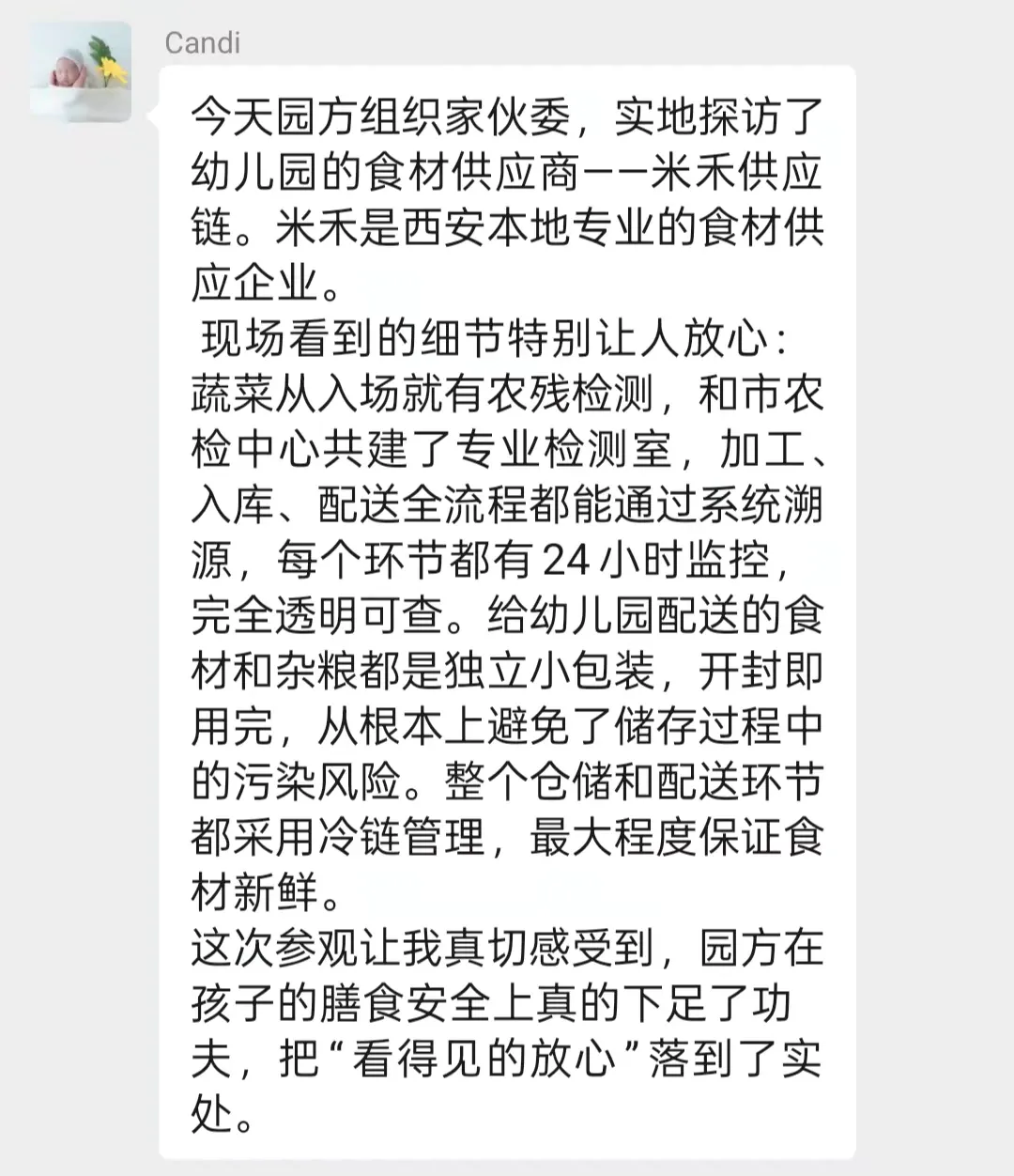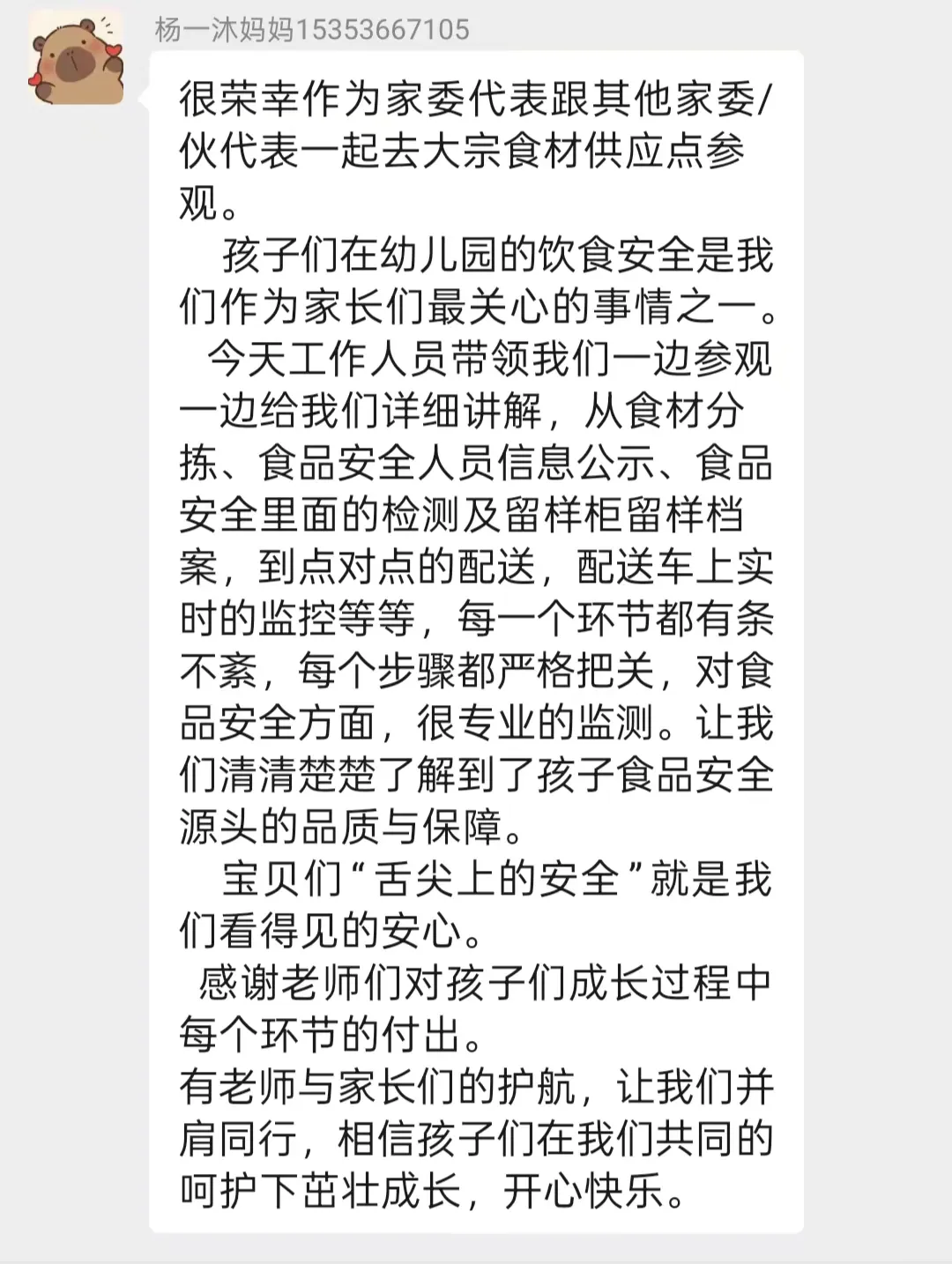 参观结束后,家伙委纷纷将自己的所见所闻分享在班级群内,同时表示,通过此次活动,家伙委员们亲身了解食材源头与规范管理的安全和可靠性。对配送企业的专业与用心深感信任与欣慰。