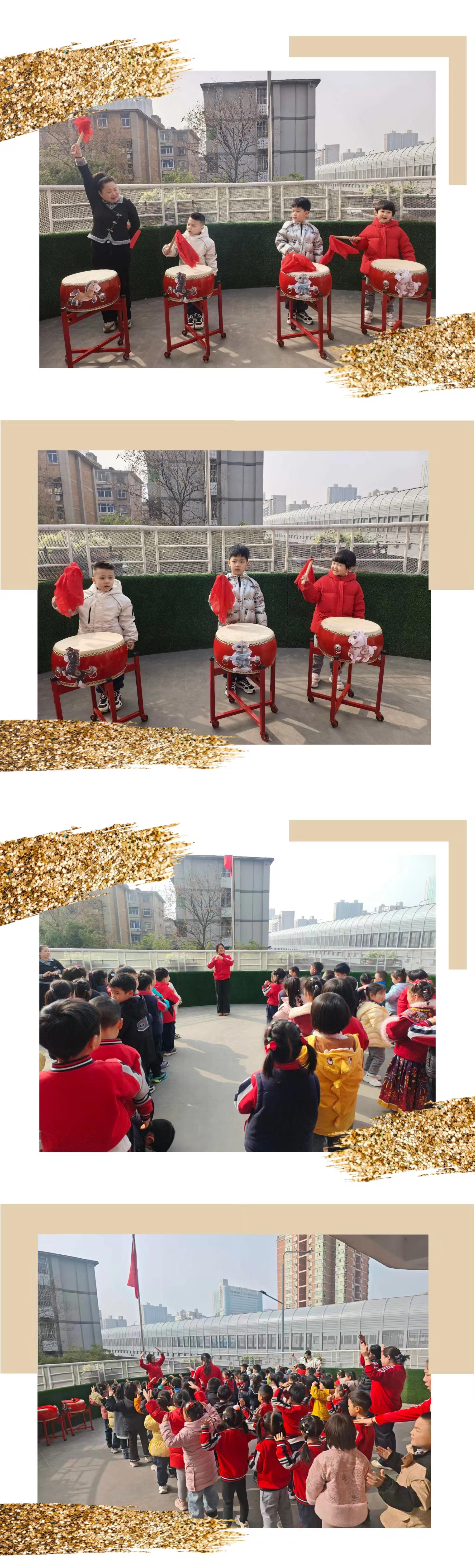 随后,在击鼓明志环节中保教主任和小、中、大班的幼儿代表依次击鼓,并在每人击鼓时带全体幼儿喊出:立德守礼、乐学善思、勇敢奋进的励志口号,激励孩子们在新学期里能不断进步,努力上进。
