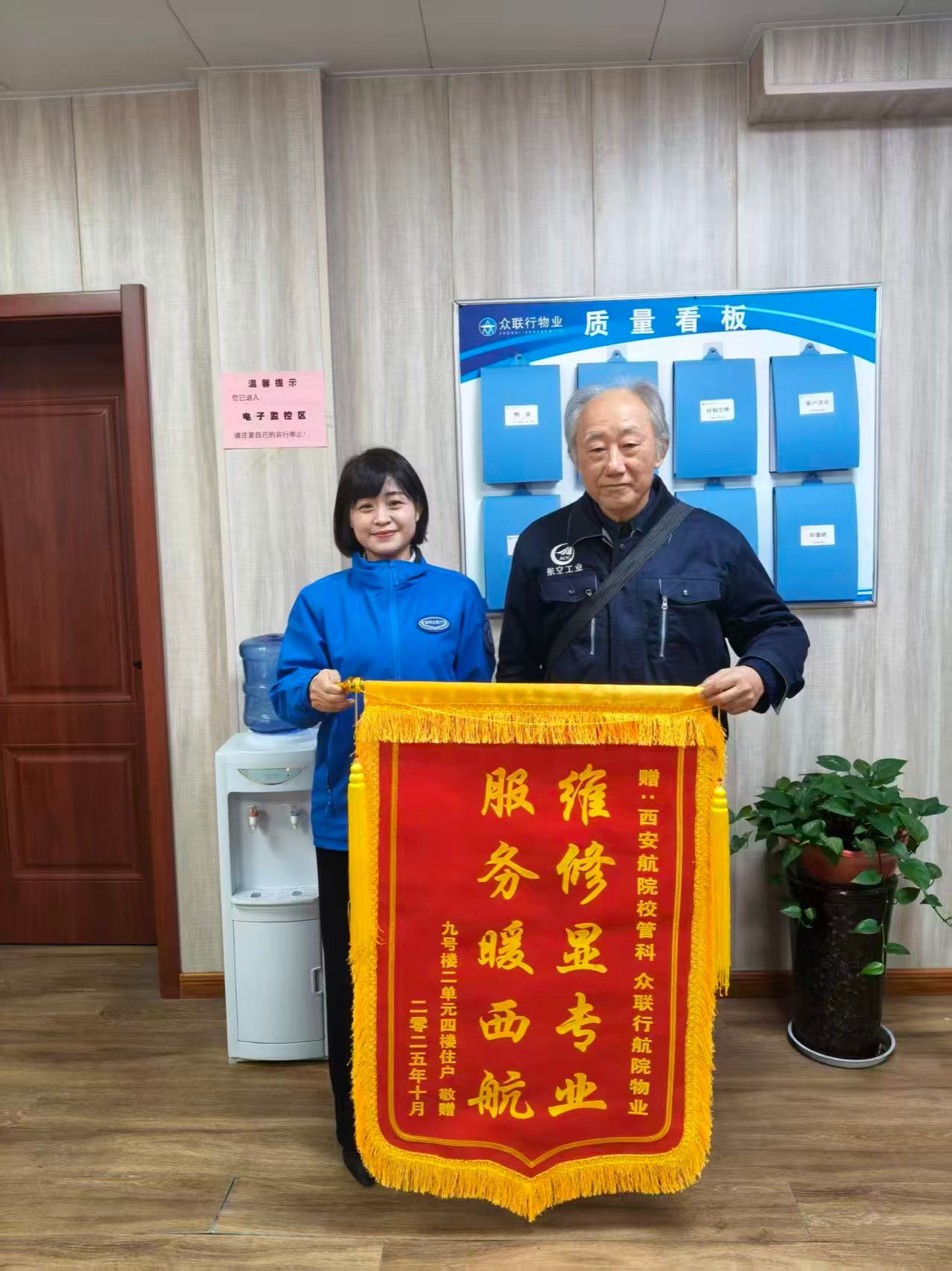 供暖试压工作启动以来,后勤保障处的专业服务与辛勤付出赢得了师生的广泛认可。近日,后勤保障处收到了一份特殊的礼物——一面由住户代表送来的锦旗。锦旗上“维修显专业,服务暖西航”的金色大字,不仅是对后勤保障处专业能力的肯定,更是对服务理念的高度赞扬。这面锦旗,是荣誉,更是责任。后勤保障处将持续提升服务品质,用实际行动践行“温暖守护”的承诺,为师生营造更加安心、舒适的校园环境。