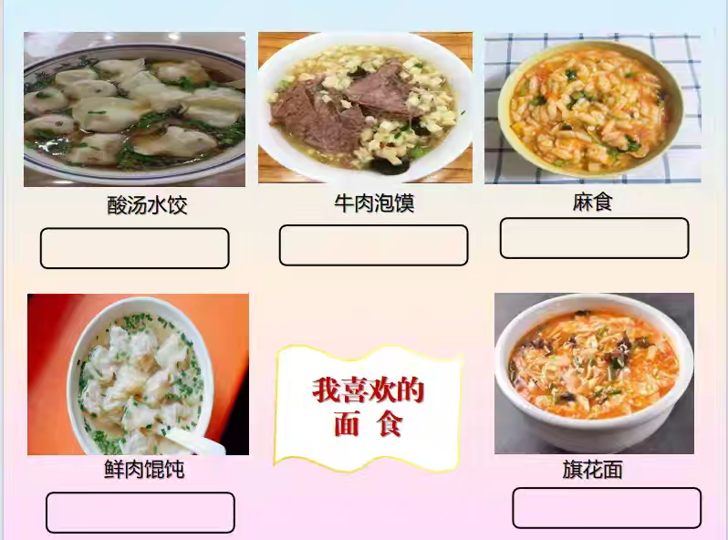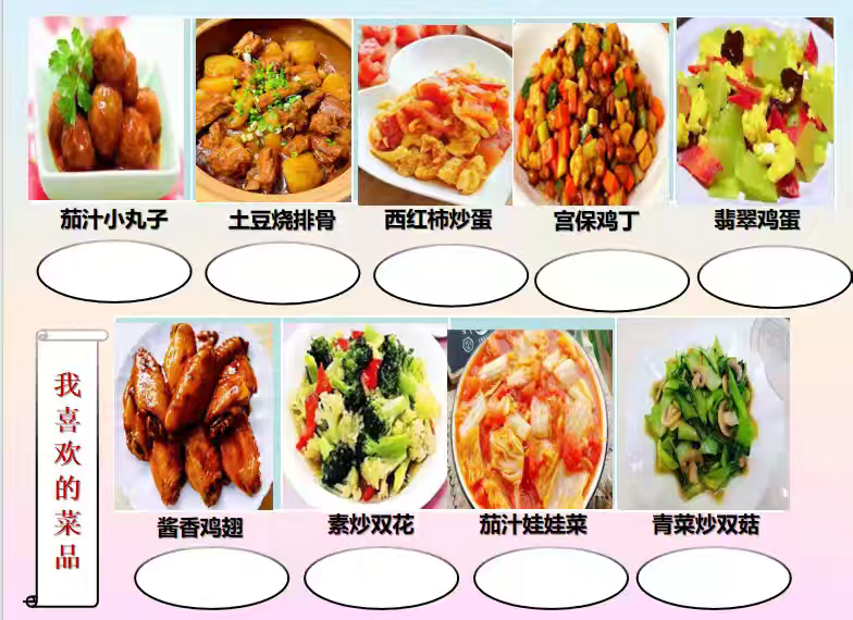 保教主任和保健医通过日常在班级陪餐的过程中的观察,以及和各班孩子们交流沟通中,了解到孩子们最爱吃的面食和常规菜品,从中选择出5种面食和9种菜品,让大、中、小班的孩子们根据日常吃到的口味选出自己最喜爱的菜肴。