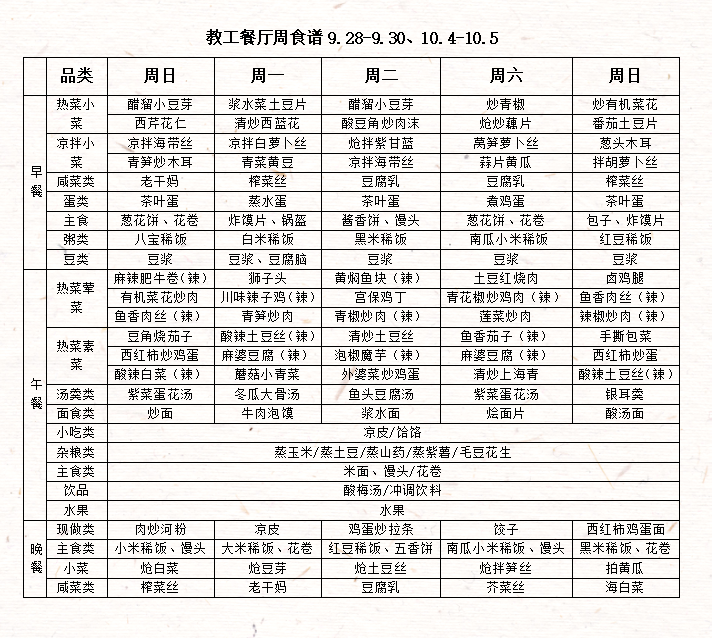 教工餐厅周食谱(9月28日——9月30日、10月4日——10月5日)